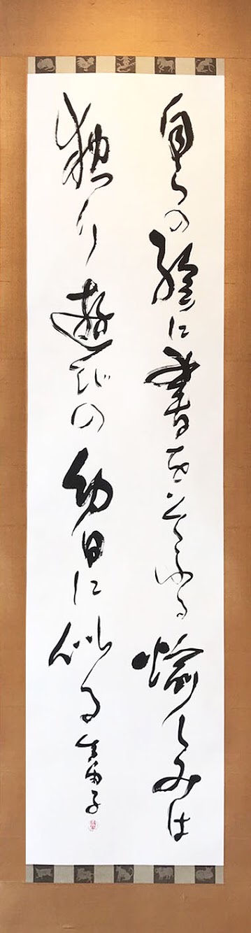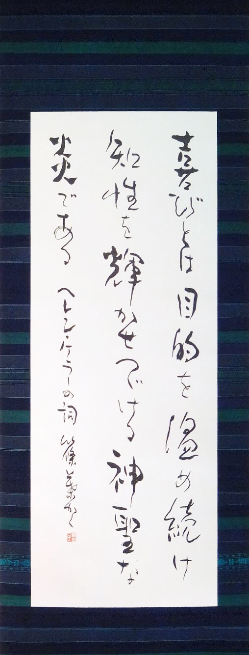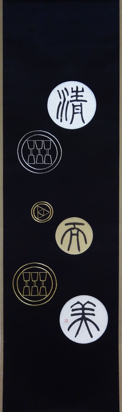 清らかにして美し。真っ黒な繻子織の帯に書をはめ込み、掛軸を作りました。 |