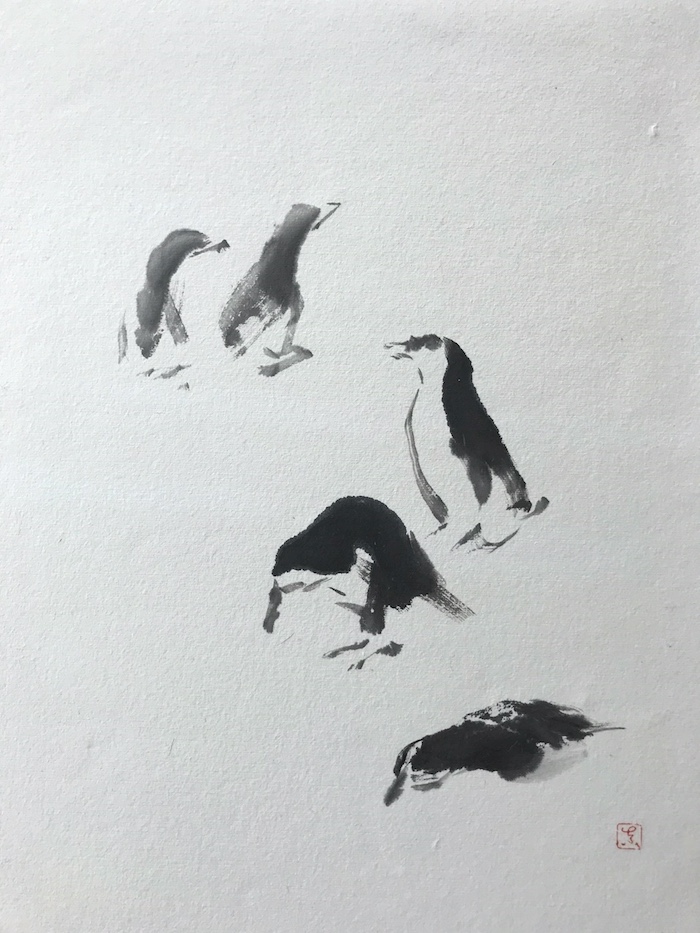 愛らしい動物を見るとつい描きたくなります。ペンギンは白黒なので特に墨で表現しやすいモデルです。 |